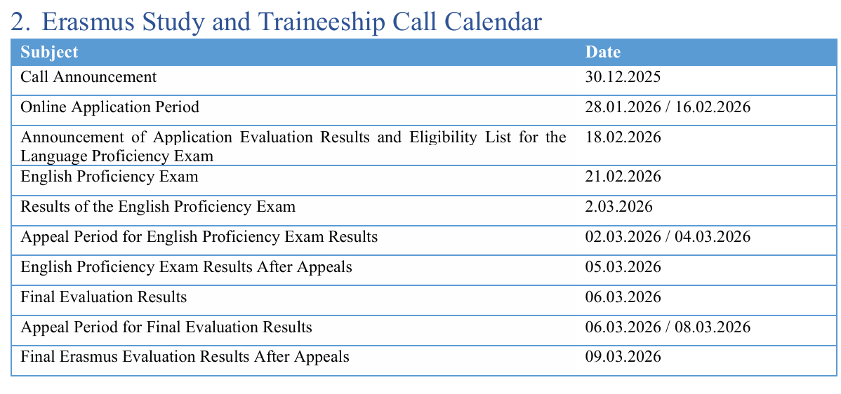 2026-2027 Academic Year Erasmus Student Mobility Calendar